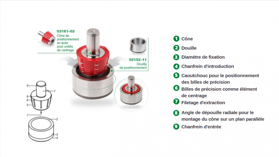 Cette unité de centrage est spécialement conçue pour du changement rapide d’outillage, notamment pour une gamme d’effort réduite par rapport aux broches à billes ou au ZERO lock.