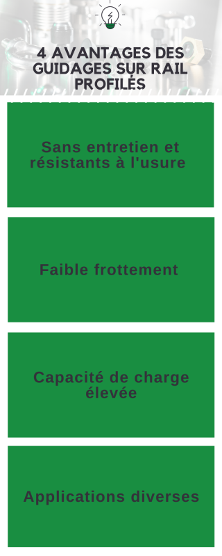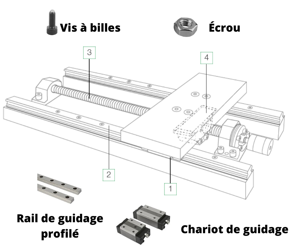 Les éléments roulants se déplacent entre le rail de guidage et le chariot de guidage sur des voies de roulement trempées.
