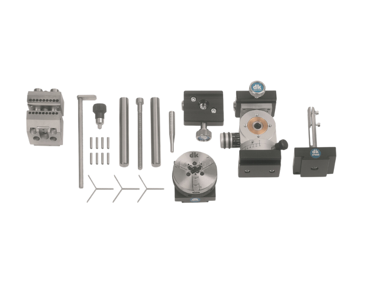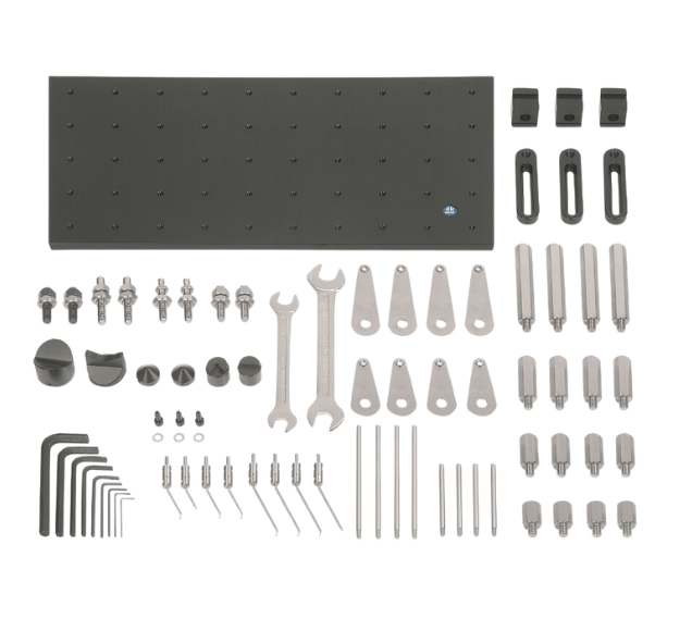 Ce kit dispose d'une large gamme d’éléments de base, de structure et de serrage. Les composants individuels peuvent être combinés à volonté. Le montage reproductible des dispositifs est rendu possible grâce à des échelles et des butées. Les éléments de serrage sont positionnés et fixés librement dans l’espace 3D grâce à des modules linéaires, rotatifs et pivotants, ce qui rend possible une fixation répétitive des pièces grâce à un serrage au point zéro avec des butées. Les montages peuvent également être réalisés en dehors de la machine de mesure avec des plaques de base.