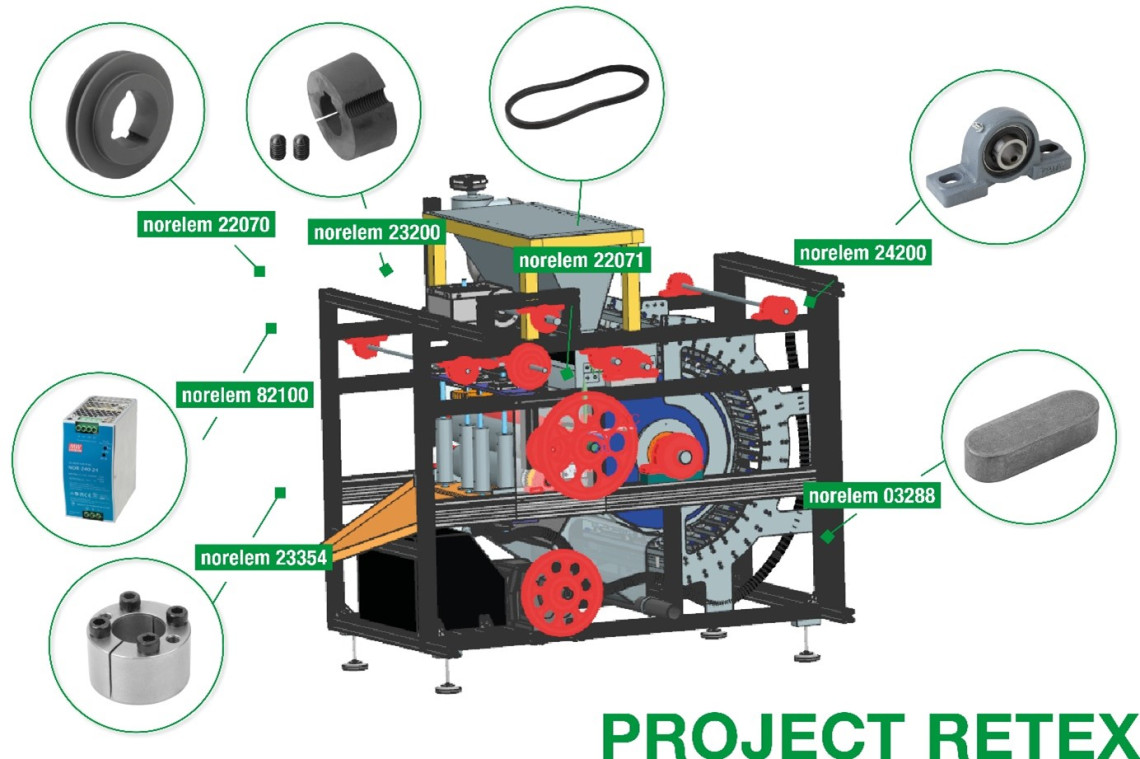 L'installation de déchirure motorisée a été réalisée à l'aide de nombreux composants norelem. Une poulie à courroie trapézoïdale avec douille de serrage taper est fixée au moteur. La poulie à courroie (22070-22501) absorbe le couple du moteur et transmet les forces à la courroie (22071-21143). La courroie est maintenue en position correcte par rapport à l'axe du moteur par la frette de serrage taper (23200-0573025). Un bague de serrage conique (23354-1528) ainsi qu'une clavette parallèle (03288-12X50) assurent une liaison positive arbre-moyeu entre la douille de serrage taper et l'arbre. D'autres courroies trapézoïdales transmettent la force d'entraînement à l'arbre de sortie, ce qui permet par exemple d'entraîner les rouleaux pour le traitement du tissu. La robuste palier auto-aligneur (24200-40208) (palier à semelle UCP) supporte l'arbre avec un minimum de frottement et le maintient en position fixe.