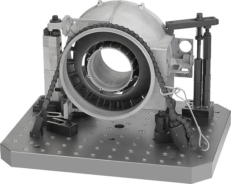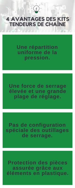 Grâce à ce système, l’utilisation d’outillages de serrage impliquant des éléments de serrage spéciaux n’est plus nécessaire. Il permet d’obtenir une force de serrage allant jusqu’à 40 kN répartie de façon uniforme sur la pièce permettant ainsi de serrer sans décalage. Des tendeurs assurent la précontrainte de la chaîne et suppriment le jeu qui devient plus grand lorsque la chaîne est plus longue. Les différents éléments du kit rendent le positionnement de la pièce flexible.