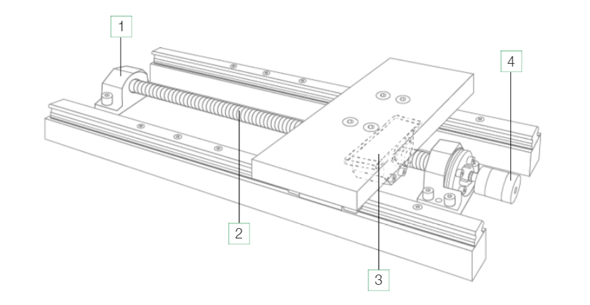- Paliers d’extrémité (palier fixe et mobile) : Pour le montage final de la vis, on associe généralement un palier fixe et un palier mobile. Le palier fixe est généralement situé du côté de l’entraînement. Ces unités de palier sont adaptées les unes aux autres et évitent ainsi une construction complexe ainsi que la recherche de paliers appropriés. Pour les paliers fixes, on utilise principalement des roulements à billes axiaux précontraints. Pour le palier mobile, des roulements à billes rainurés suffisent dans la plupart des cas.